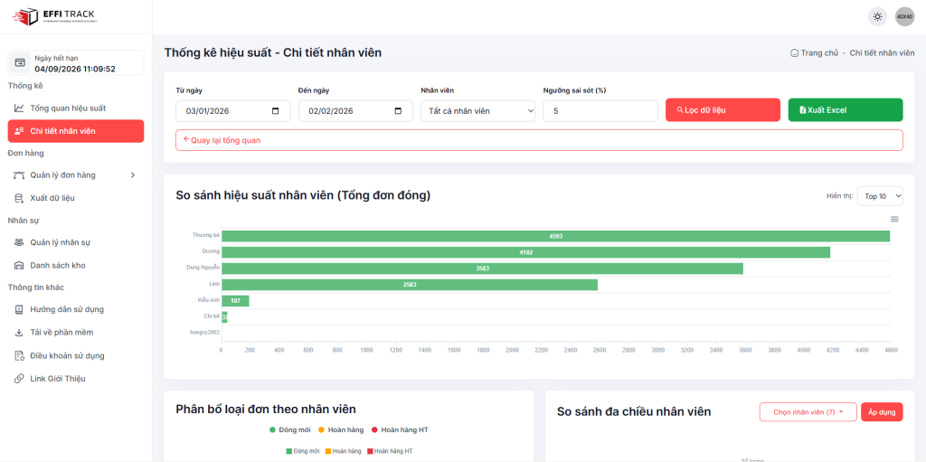 Bên cạnh thống kê tổng quan, Effitrack còn cung cấp Dashboard chi tiết hiệu suất nhân viên, hỗ trợ quản lý kho theo hướng minh bạch và đo lường rõ ràng: