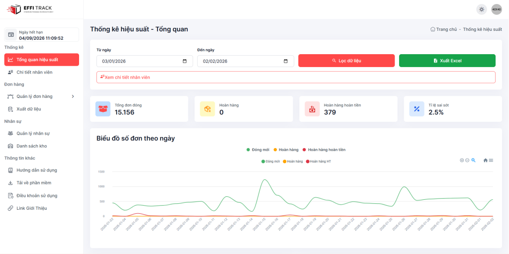 Ngoài ra, Effitrack cho phép lọc dữ liệu theo khoảng thời gian cụ thể và xuất báo cáo Excel, hỗ trợ đối soát, lưu trữ và báo cáo nội bộ nhanh chóng khi cần.